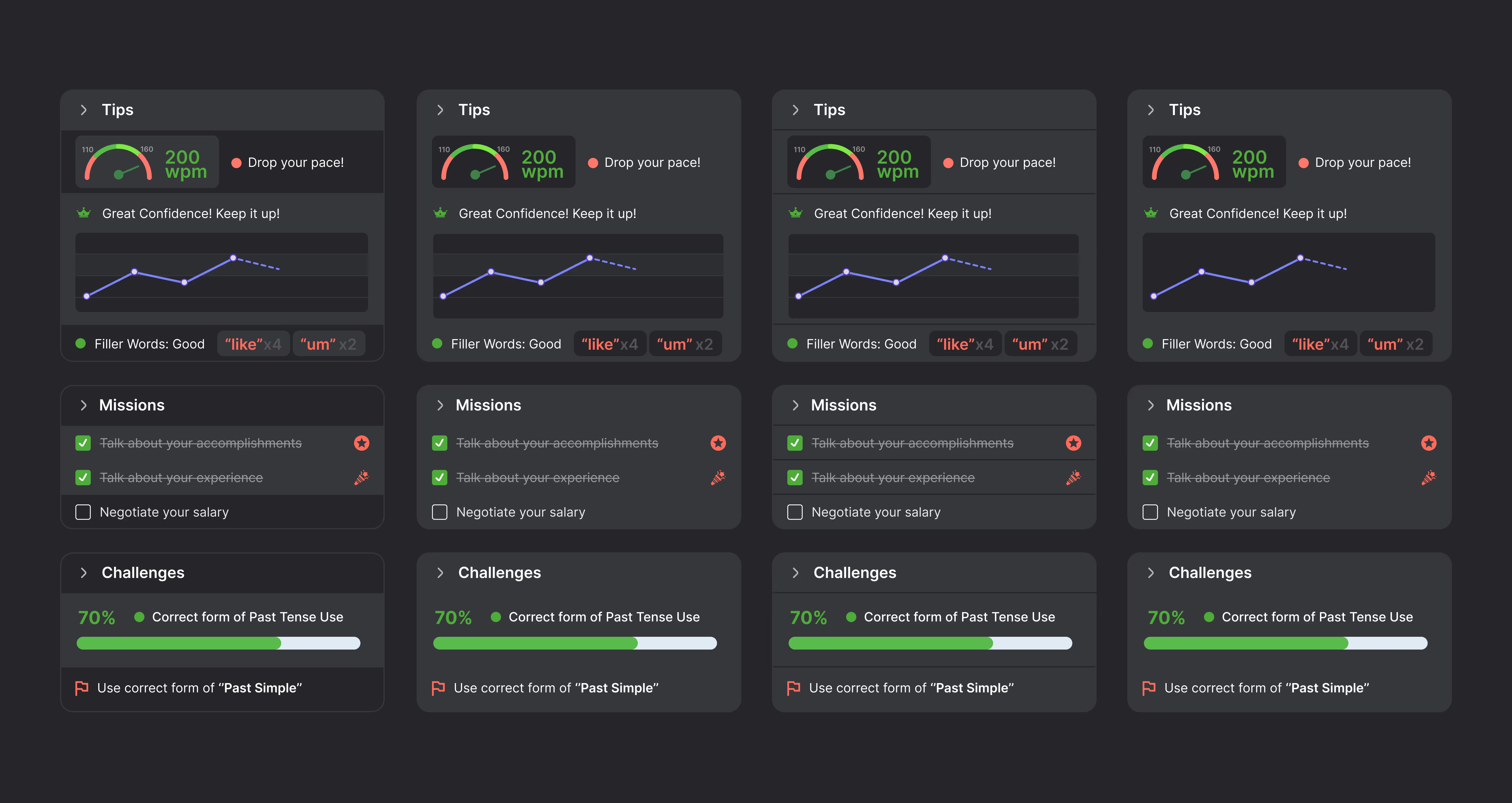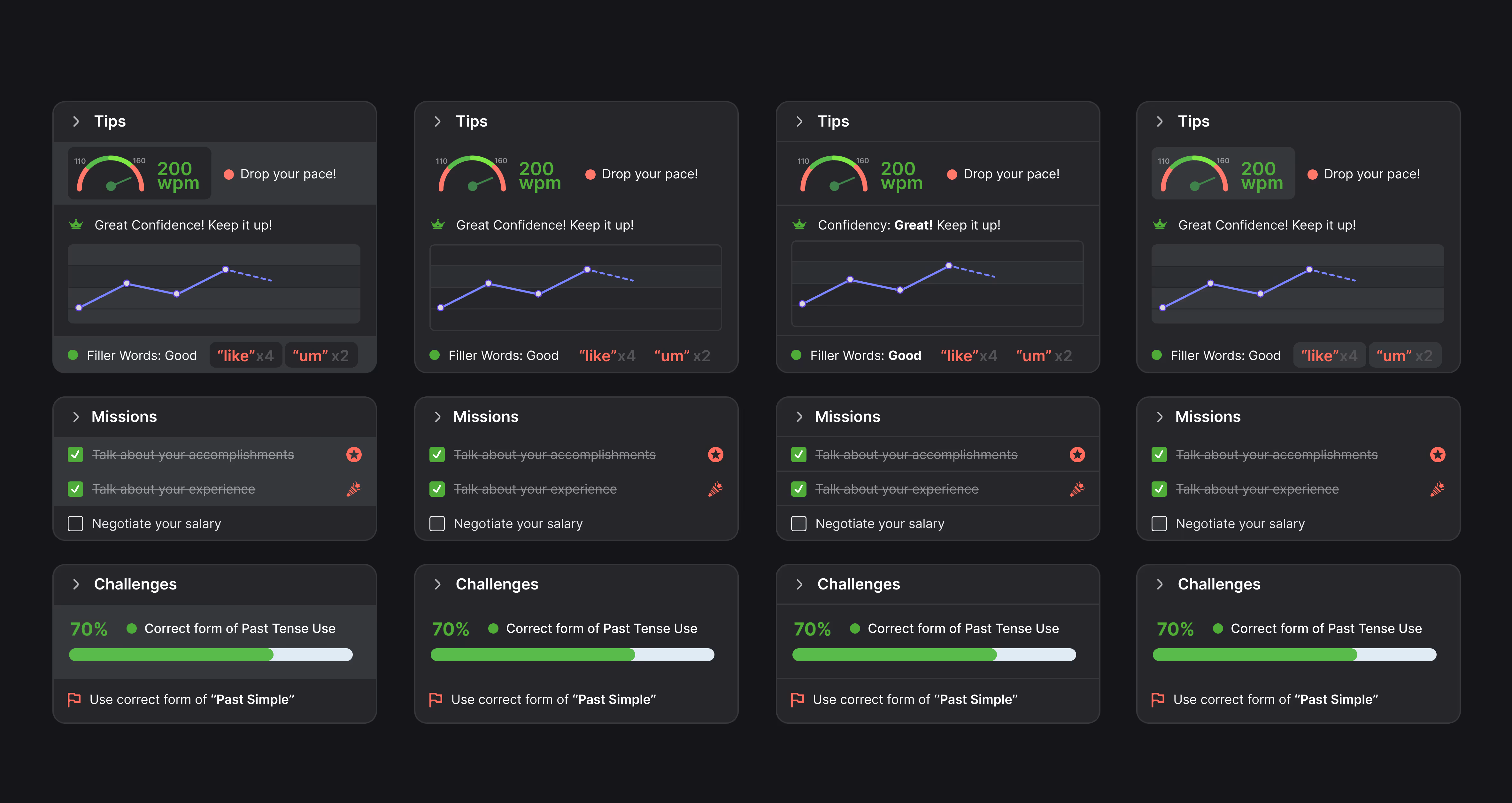 The main challenge in designing the UI was to represent the product's vision of creating the next generation of language learning using the latest AI technology. The design also needed to incorporate elements of gamification to engage users. I developed a futuristic, original dark theme UI concept to meet these requirements. The image below shows the post-conversation feedback page, which includes various charts and visualizations to provide users with a comprehensive review of their performance.